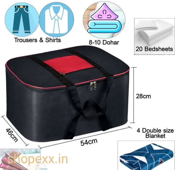 Product Name: Pack of 2 Nylon Clothes & Blanket Storage Bag | Under bed Packing Bag | Large Storage for Blankets | Clothes Organizer | Big Size Clothes Cover Organizer | Moisture Proof Cloth Bag for Clothes, Towels, Blankets & Sarees | Wardrobe Organizer with Zip Closure & Strap | Red & Black (69 Litres)